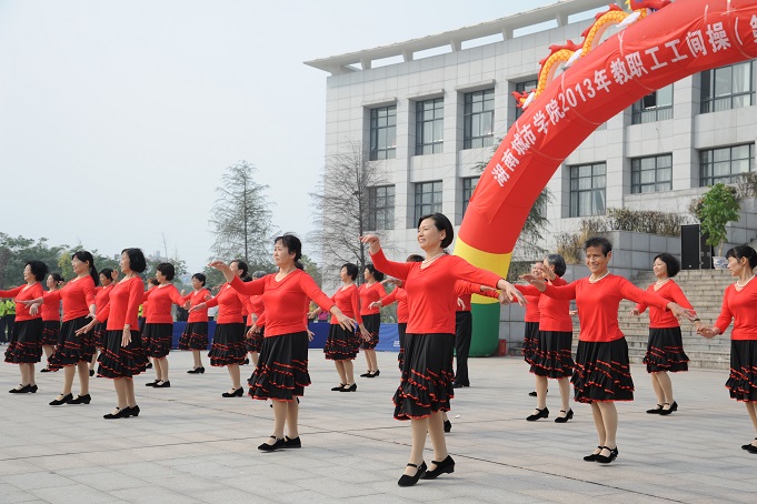 下午,学校教职工工间操(第九套大众广播体操)比赛在兴城广场隆重举行,全校22个分工会及离退休老同志共23支代表队500余名教职工参加了比赛,上千名师生到现场为参赛队伍加油呐喊。