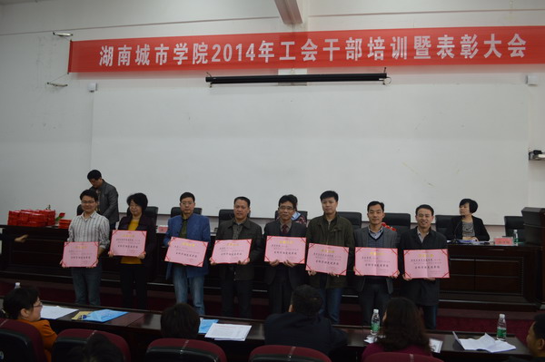 校工会女工委副主任石清丽宣读省、学校的各级表彰决定,其中获得表彰的有全国教科文卫体工会颁发的“模范职工之家” :马博平台工会、2013年度湖南省模范教职工之家:马博平台工会、省教育工会2013年度民主管理工作先进单位:马博平台工会、省教育工会2013年度直属基层工会模范教职工小家:外国语学院分工会等先进集体;省教育工会评选的“纪念毛泽东同志诞辰120周年教职工书画作品展”中,陈丽霞老师的国画《浩气长存》获一等奖、匡列辉老师的楷书条幅获二等奖、2013年度《湖南教工》优秀通讯员周敏。以及获得校工会表彰的有:美术与艺术设计学院分工会等8个单位为“工会工作目标管理先进单位”;通信与电子工程学院分工会为“先进教职工小家”;户外健身协会等2个协会为“工会工作优秀协会”;计划财务处等4个单位为“校务公开工作先进单位”;外国语学院分工会等4个单位为“工会工作活动特别奖”;何亮云等22人为“三育人”先进个人;王道静等177人为“工会积极分子”,与会领导分别颁发奖牌和证书。
