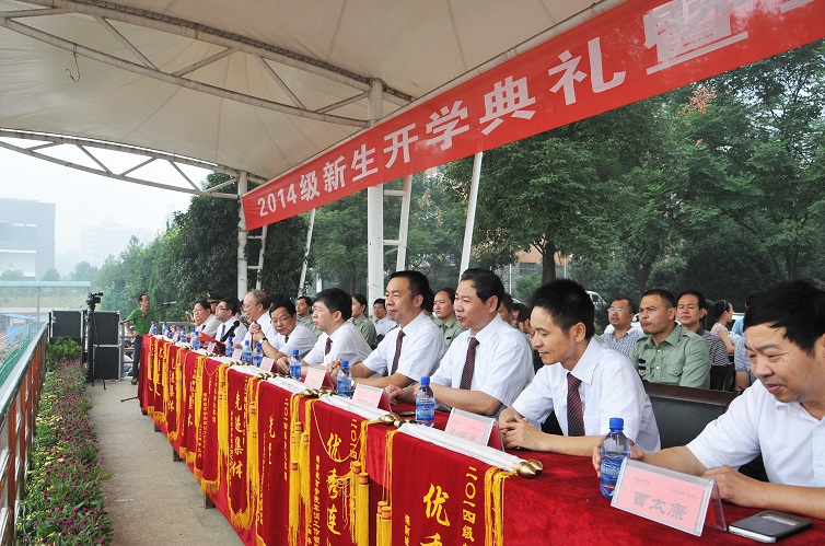 (本网讯)928日上午,我校2014级新生开学典礼暨军训汇报表演在校本部田径场隆重举行。在家的校领导,各机关处室、各二级学院负责人以及2014级全体新生参加了典礼。典礼由党委副书记、副校长孟昭武主持。