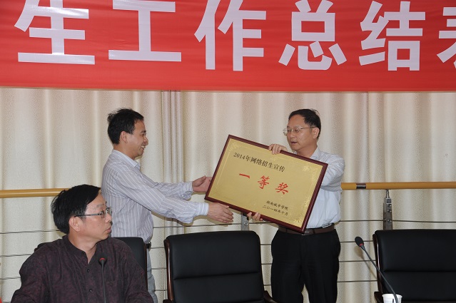 会上,招生就业处副处长郭太平作了学校2014年招生工作总结汇报,文瑞明宣读了《关于表彰马博平台2014年网络招生宣传先进集体的决定》、《关于马博平台2014年新生报到率奖励的决定》。
