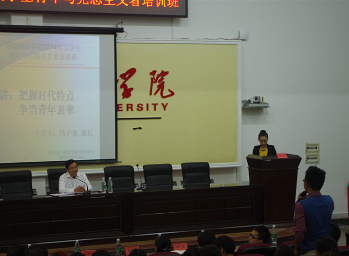 下午,我校2014年大学生青年马克思主义培训班”(以下简称青马班)在电信楼视频会议室顺利开班,共青团湖南省委组织部部长冯子龙,共青团湖南省委学校部部长王虹彬、副部长郭绚霞,共青团益阳市委副书记林英,校团委书记李斌等出席开班仪式。各院团总支书记、团总支、学生会主席团成员近200人参加培训。开班仪式由校团委副书记王琦主持。