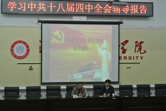 下午,党委书记李建华在视频会议室为城市管理学院师生党员上了一堂“学习中共十八届四中全会辅导报告”的专题党课。党课由城管理学院党总支书记余洪主持,该院全体学生党员、入党积极分子以及部分教师党员聆听了本次党课。