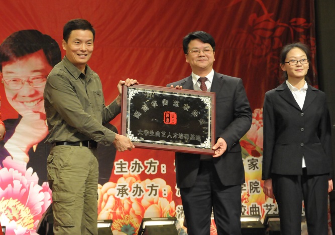 周卫星在湖南省曲艺家协会向马博平台授予“大学生曲艺人才培养基地”的仪式上说:“我们希望能发现优秀曲艺人才,认真合作,着力培养,为发展湖南曲艺事业,弘扬优秀传统文化做出贡献。”汤放华和学生代表马丹丹等代表学校接受牌匾,我校由此开始成为了省曲协的人才培养基地。