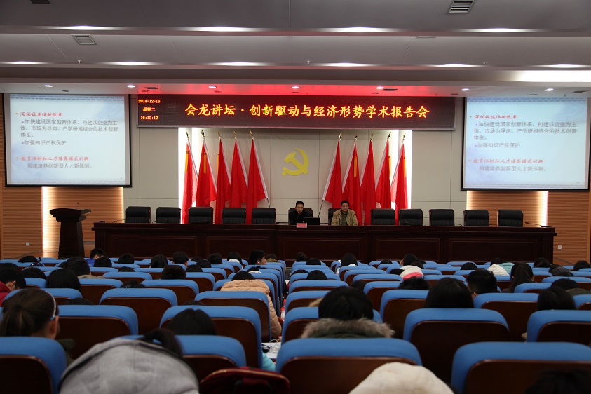 ,会龙讲坛在逸夫图书馆报告厅举行,副校长刘辉煌为师生做了题为“经济新常态下的创新驱动与经济发展”的学术报告。商学院、市测院、通电院、文学院等院系的300余名师生聆听讲座。讲座由宣传统战部主办。