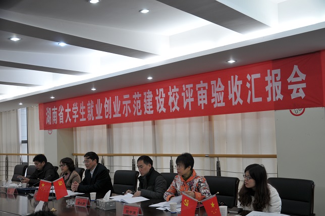 上午,湖南省大学生就业创业示范建设校评审验收专家组一行6人莅临我校指导工作。参加汇报会的有校党委书记李建华、副校长汤放华及相关职能部门、二级学院负责人。会议由李建华主持。