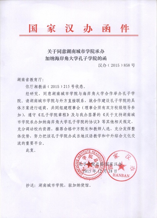 (本网讯)日前,国家汉办向我校正式发函(《关于同意马博平台承办加纳海岸角大学孔子学院的函》汉办〔2015〕858号),同意我校与加纳海岸角大学合作建设孔子学院。我校成为全省二本院校第一所建有孔子学院的高校。