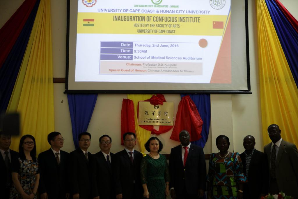(本网讯)加纳当地时间6月2日上午,我校与加纳海岸角大学合作创办的孔子学院在该校大礼堂举行了揭牌仪式。中国驻加纳大使馆、加纳文化旅游部、湖南省教育厅代表团、我校代表团、当地政府相关机构负责人、海岸角大学师生以及各界嘉宾共600余人出席了揭牌仪式。