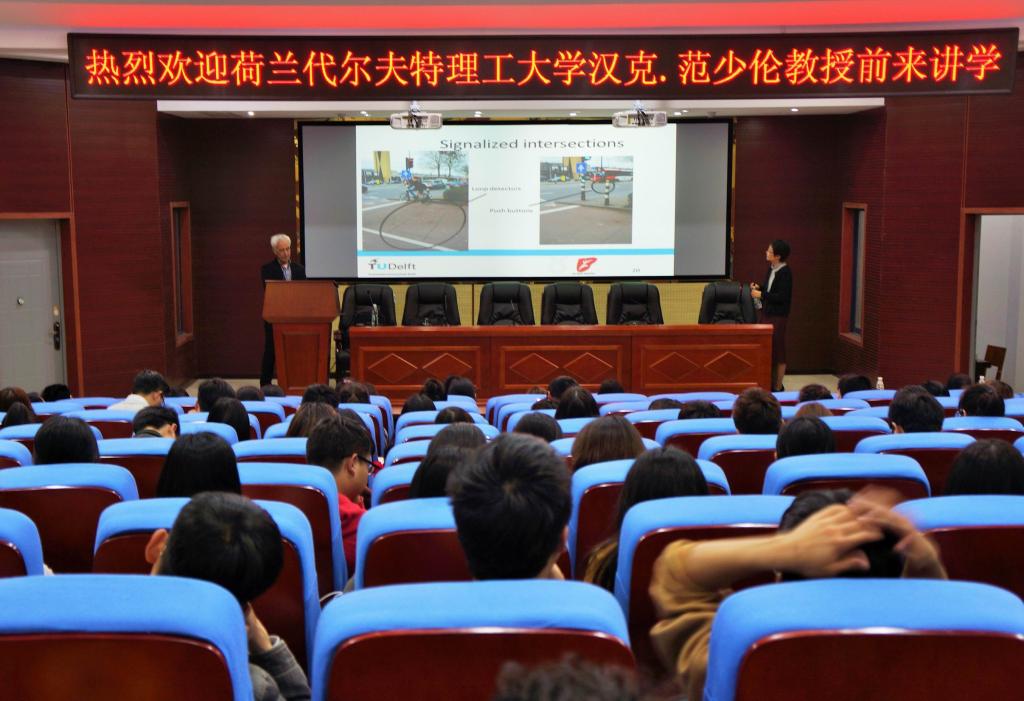 (本网讯)4月6日下午,国际知名学者、荷兰代尔夫特理工大学汉克·范少伦(Henk J.van Zuylen)教授应邀在建筑规划楼一楼报告厅举行题为“荷兰自行车交通的发展与规划”的学术讲座。讲座由湖南大学李洁博士担任翻译,建筑与城市规划学院副院长张国武教授主持。益阳市城市规划设计院全体设计人员、市规划局部分领导及建筑与城市规划学院师生参加了本次讲座。