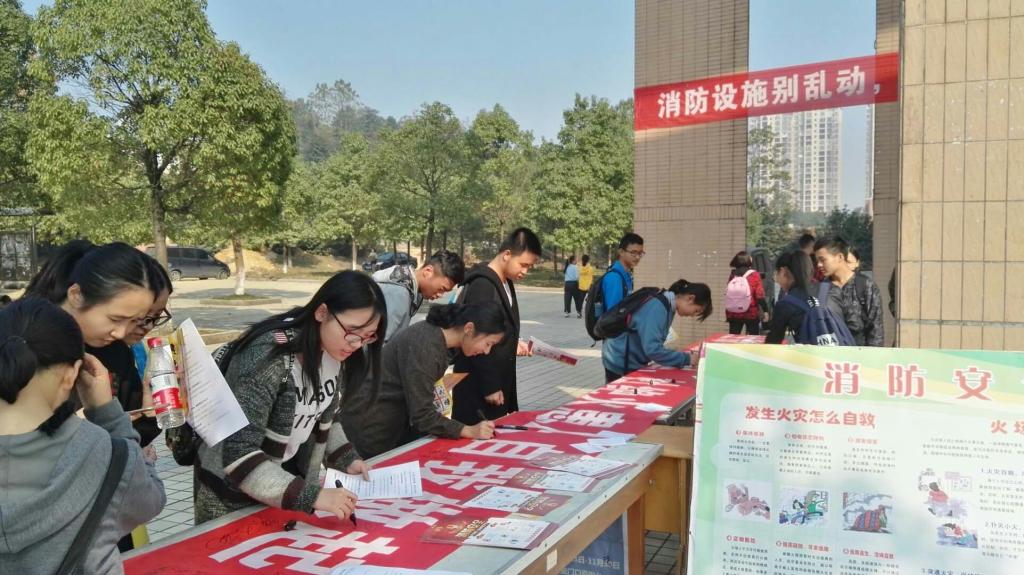 本次宣传展板采用简洁的文字加通俗易懂的漫画形式,详细介绍了如何防止火灾,如何扑救初起火灾、火灾现场如何逃生、如何正确拨打火警电话等消防知识,宣传内容吸引了众多学生热情参与。在现场,消防志愿者们主动向大家和宣传消防知识,引导大家积极参与签名仪式,同学们纷纷在条幅上留下自己的名字以示对消防的关注和重视。
