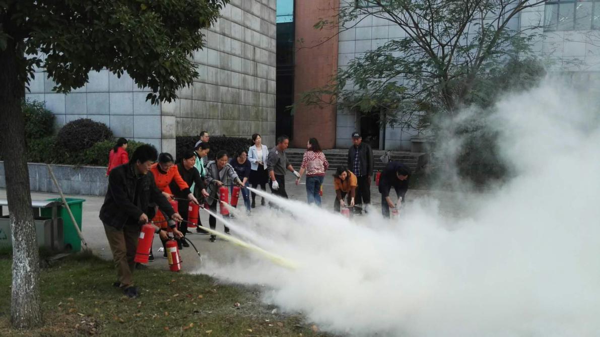 在消防灭火演练中,学校图书馆员工听取了关于灭火器的正确使用方法和注意事项,并通过自身的实际灭火操作,掌握了相应的灭火技能。