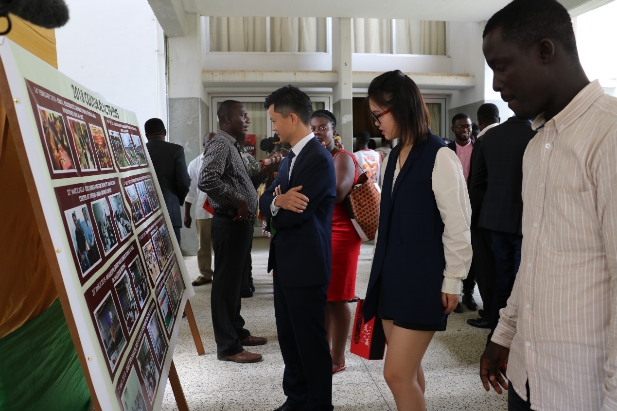 结合全球孔院日庆祝活动,此次庆典除了室内的舞台表演以外,还有室外展览。走廊上陈列的12块大型展板尽数呈现两年以来海岸角大学孔子学院的丰硕成果、师资力量、文化活动、学生风采等等。文艺汇演之后,嘉宾游览其中,对孔子学院的成就赞不绝口。