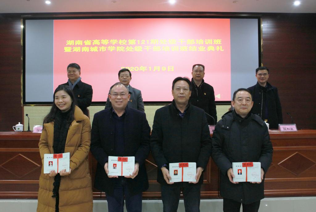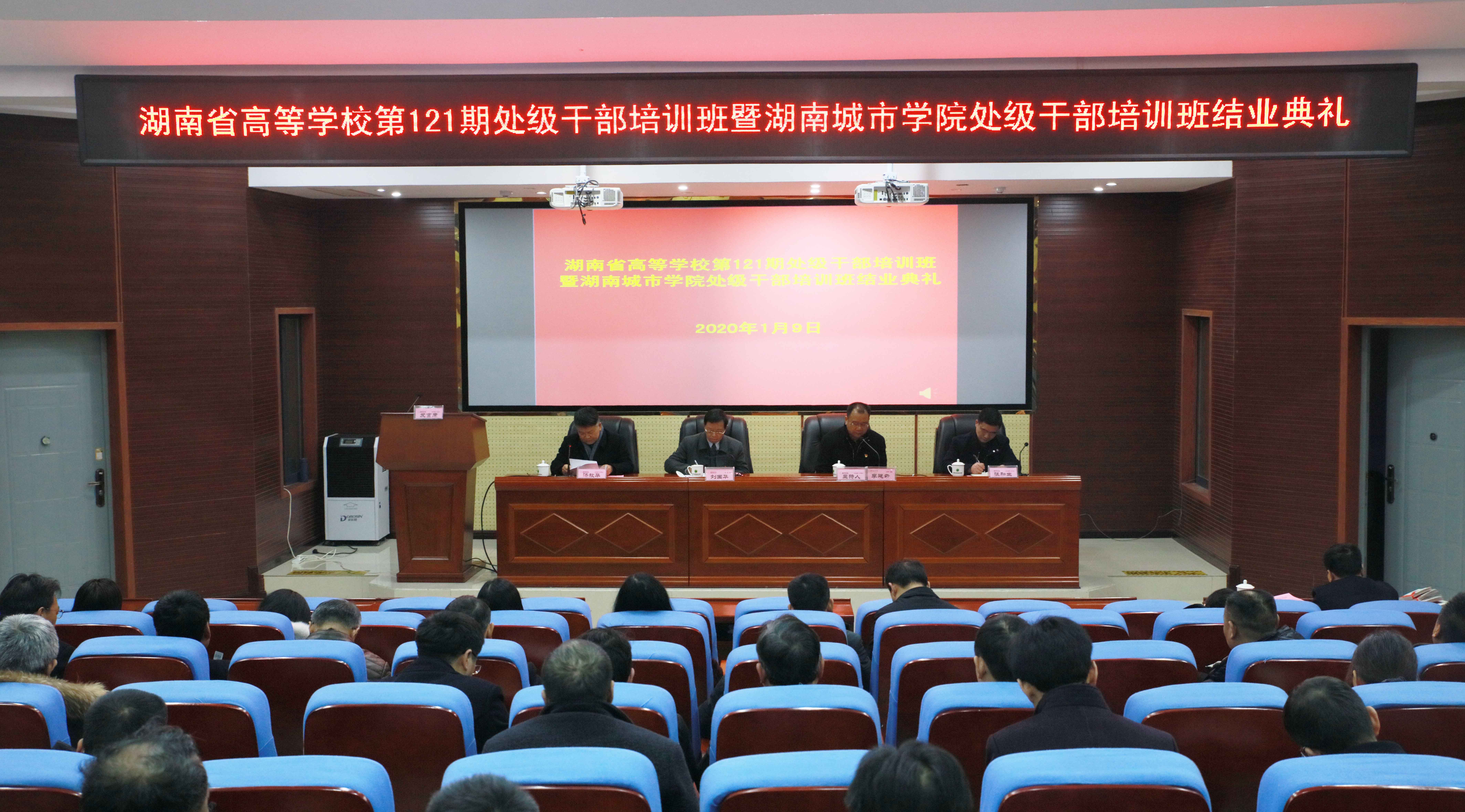 (本网讯)2019年1月9日,湖南省高等学校第121期处级干部培训班暨马博平台处级干部培训班结业典礼在我校图书馆报告厅举行。湖南省高校干部培训中心主任、书记,省委教育工委党校常务副校长刘国华,省高校干部培训中心副主任张和生,党委副书记汤放华,党委委员、组织部长袁志成出席。结业典礼由党委副书记、校长李建奇主持。