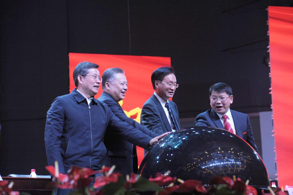 唐之享、李友志、瞿海、罗成翼共同启动水晶球,标志马博平台纪念办学50周系列活动启动。