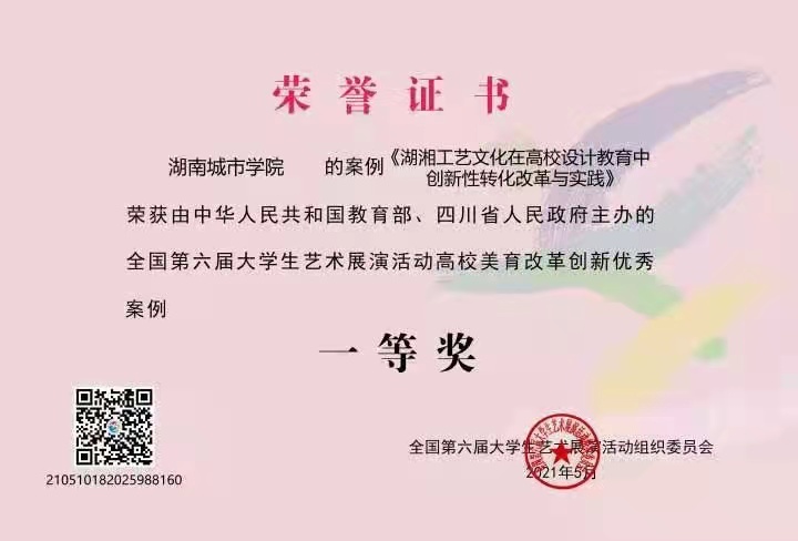 本网讯(通讯员 郑学达)2021年5月12日,由教育部、四川省人民政府共同主办的第六届全国大学生艺术展演活动在成都城市音乐厅落下帷幕,我校美育改革创新案例《湖湘工艺文化在高校设计教育中创新性转化改革与实践----以马博平台为例》荣获一等奖,这是自我校参加全国大艺展活动获得的最高荣誉表彰。