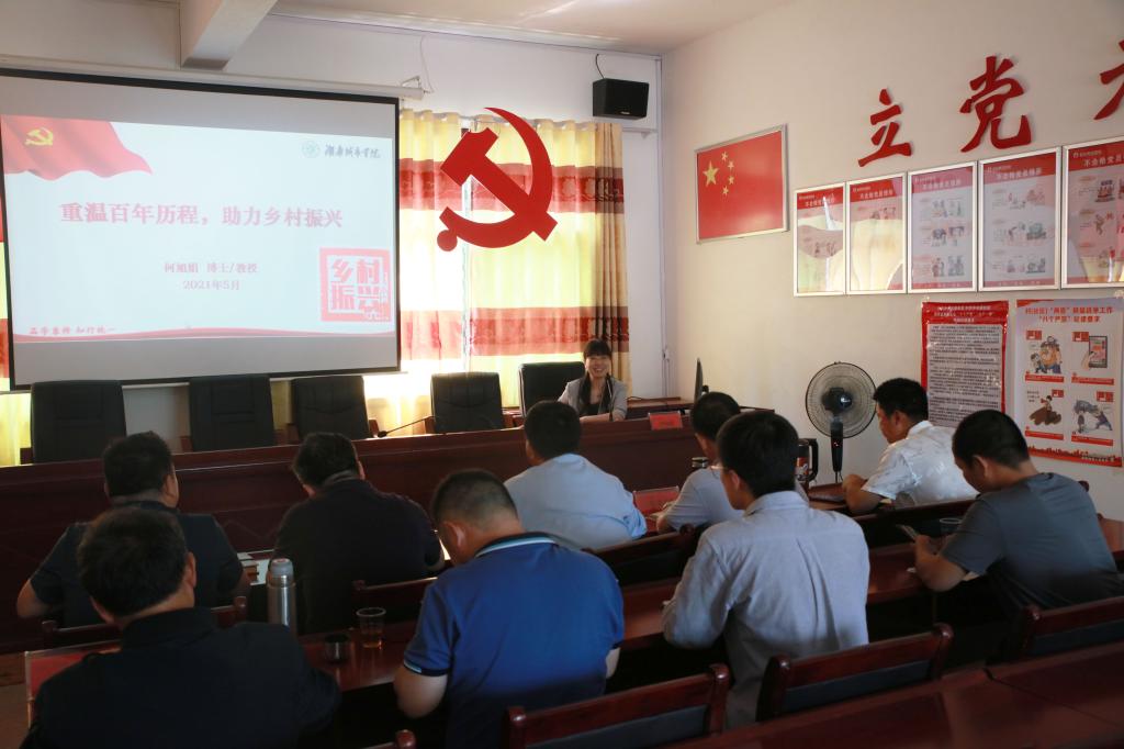 在苏溪村村民服务中心会议室,何旭娟一行与村支“两委”、驻村工作队员一起观看了“湖南省新一届村(社区)‘两委’成员第三次集中培训和乡村振兴驻村干部培训”视频教学片。视频教学结束后,何旭娟为与会人员作了一堂题为“重温百年历程,助力乡村振兴”的微宣讲,分析了中国共产党百年乡村建设历程,阐述了新时代乡村振兴的任务要求,鼓励大家携手共进,在乡村振兴中书写山乡巨变。