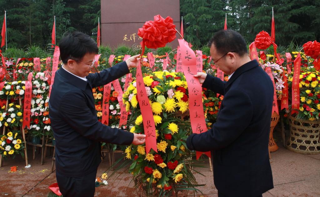 上午9:30,李建奇率全体成员向毛泽东铜像敬献花篮,寄托对毛主席的无限敬仰之情。李建奇书记、汤放华校长缓步上前,仔细整理花篮上的红色缎带,全体在场人员向伟人铜像鞠躬致敬。