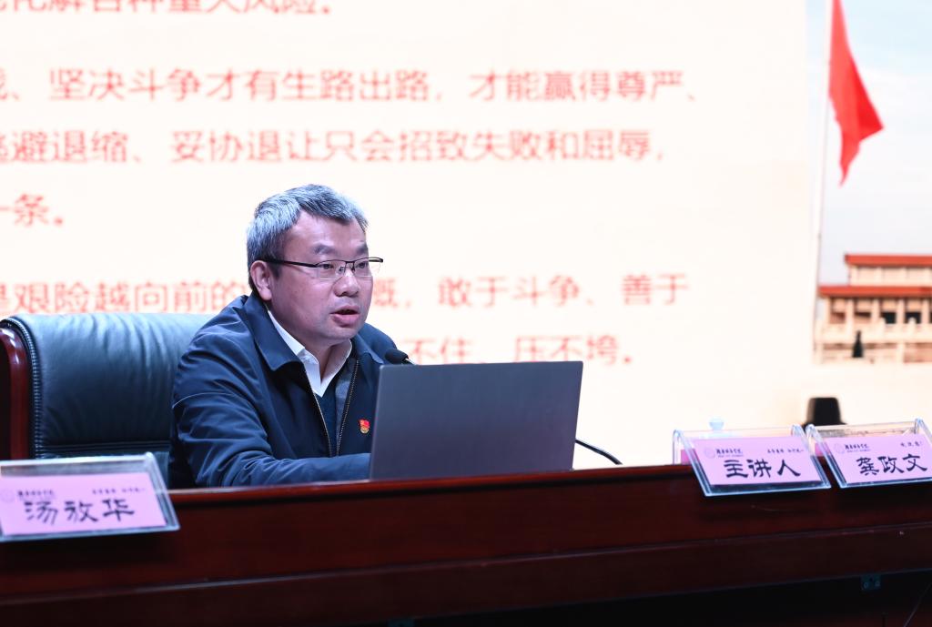汤放华指出,十九届六中全会全面总结党的百年奋斗重大成就和历史经验,强调了“两个确立”的决定性意义,对新时代更好地坚持和发展中国特色社会主义、实现中华民族伟大复兴产生重大而深远的影响。他强调,高校要认真落实立德树人根本任务,坚持以习近平新时代中国特色社会主义思想为指导,把学习贯彻党的十九届六中全会精神与学习贯彻习近平总书记关于教育的重要论述相结合,与党史学习教育相结合,从党的百年奋斗重大成就和历史经验中汲取智慧、凝聚力量,鼓起广大教职工奋进新时代的精气神,激发学生逐梦新征程的鸿鹄志。