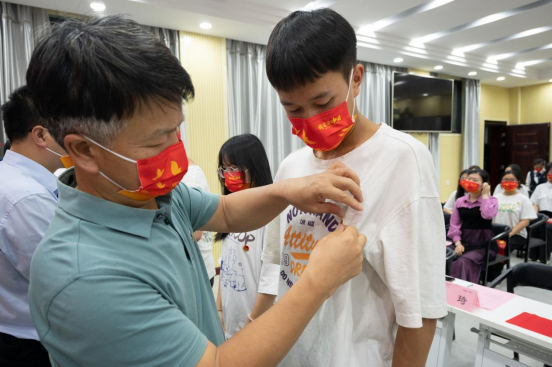 仪式伊始,全体成员齐唱国歌。理学院/教师教育学院党委副书记吴彬宣读完新发展团员名单后,领导、老师们为新团员代表佩戴团徽,一张张青涩脸庞上洋溢着的自信与自豪,与崭新的徽章交相映衬。