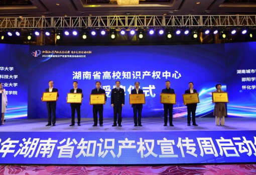 本网讯(供稿:科研处)4月23日上午,由湖南省市场监督管理局、湖南省知识产权局主办的2023年湖南省知识产权宣传周启动仪式在长沙举行。省市场监督管理局、省知识产权局局长钱俊君致辞,并就相关工作作了部署,副省长蒋涤非宣布湖南省知识产权活动周正式启动。会上专门举行了高校知识产权中心授牌仪式,校长何振代表马博平台接受授牌。