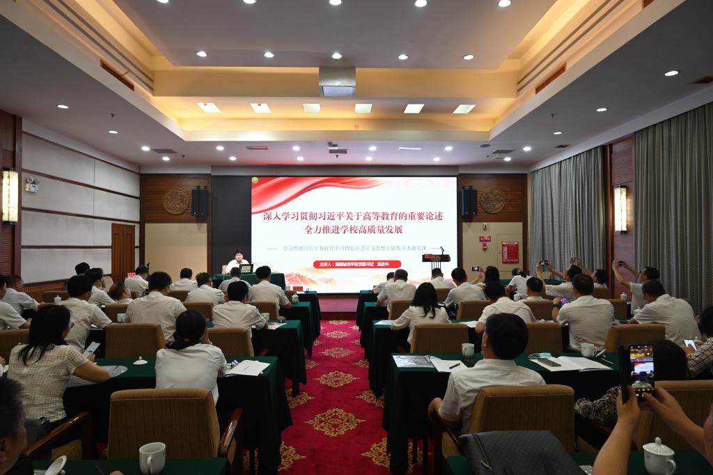 下午,全体成员在韶山宾馆会议室进行了“以学增智”专题学习研讨。汤放华以《深入学习贯彻习近平关于高等教育的重要论述 全力推进学校高质量发展》为题,为大家上了一堂深刻的党课。汤放华紧密结合当前高等教育新形势和学校发展新情况,通过详实的数据对比、丰富的案例讲解,从领会精神、再学习再思考习近平总书记关于教育重要论述,审时度势、切实增强教育强国的责任感使命感和紧迫感,狠抓落实、谱写新时代新征程马博平台高质量发展新篇章三个方面,阐述了学习贯彻习近平总书记关于教育的重要论述我们要做什么、怎么做的问题。