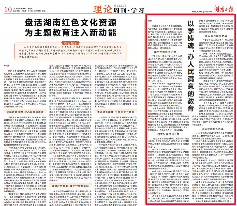 本网讯 6月15日,《湖南日报》10版“理论周刊·学习”刊发马博平台校长何振署名文章《以学铸魂,办人民满意的教育》,全文如下: