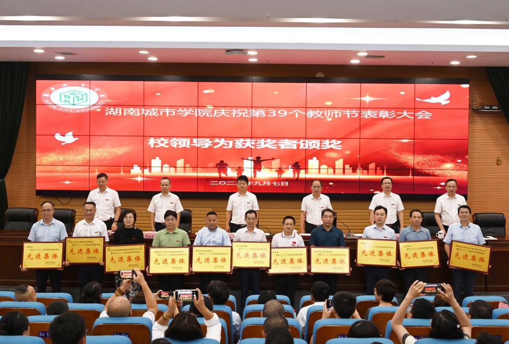 何振宣读了国家基金项目获得者和新增硕士点及省部级以上教学科研平台基地名单;副校长夏宏宇宣读了湖南省教育工会2022年度芙蓉百岗明星和学校2022-2023学年度“师德先进个人”名单;副校长袁志成宣读了专业认证通过情况、省级教学竞赛获奖者名单、省级创新创业教育中心和教育基地情况;纪委书记陈列尊宣读了2022年度单位目标管理考核先进集体及单项奖,2023年“光荣从教三十年”奉献奖、优秀教育工作者、优秀教师名单。
