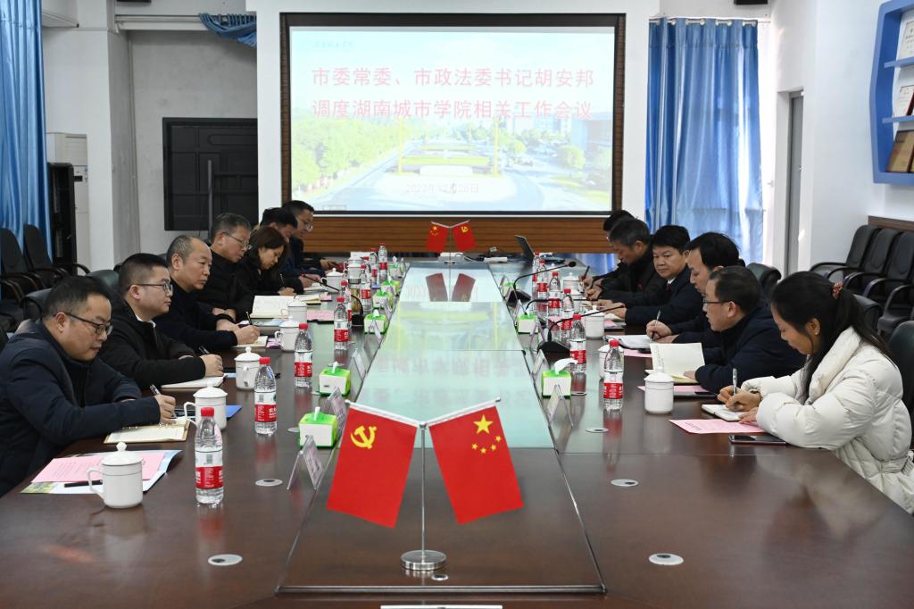 本网讯(记者 博夕)12月26日下午,益阳市委常委、政法委书记胡安邦来我校调研指导校园安全稳定工作,并在建规楼402室召开座谈会。校党委书记汤放华、副校长袁志成出席,益阳市委网信办、市公安局、益阳移动公司、电信公司、联通公司相关负责人以及我校相关部门负责人参加。