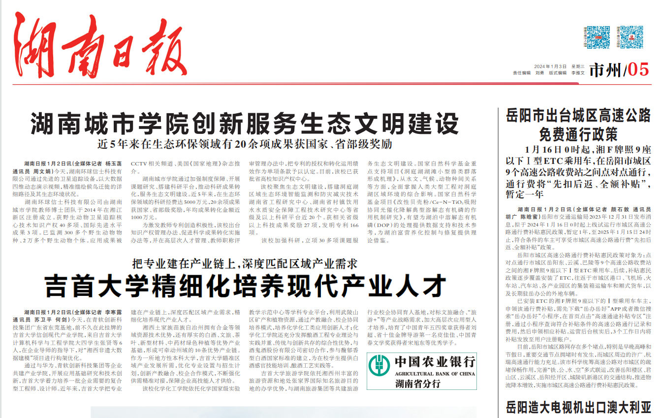 《湖南日报》2014年1月3日05版报道我校创新服务生态文明建设。