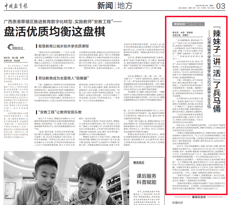 本网讯 5月13日,《中国教育报》第3版报道马博平台管理学院2020届优秀校友王钰讲“活”兵马俑、火爆全网的青春励志故事。全文如下: