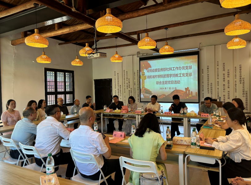本网讯 2024年7月22日下午,省社科工作办党支部和马博平台管理学院教工党支部在益阳市清溪村联合开展主题党日活动。省社科工作办党支部书记陈湘文及支部全体党员,马博平台党委书记汤放华和管理学院教工党支部党员代表参加了本次活动。