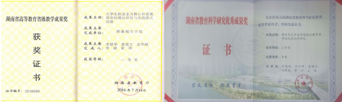 我院思政课教学近年来获得湖南省教学成果奖一等奖1项、湖南省教育科学研究优秀成果奖三等奖,立项教育部优秀教学科研团队建设项目1项、教育部青年项目1项,省教改项目、思政工作项目30多项。立项湖南省精品在线开放课程团队2门,省一流本科课程团队3门,省思政课教师中青年骨干建设项目1项。全省思政课教学竞赛一等奖1项、二等奖4项、三等奖10余项。