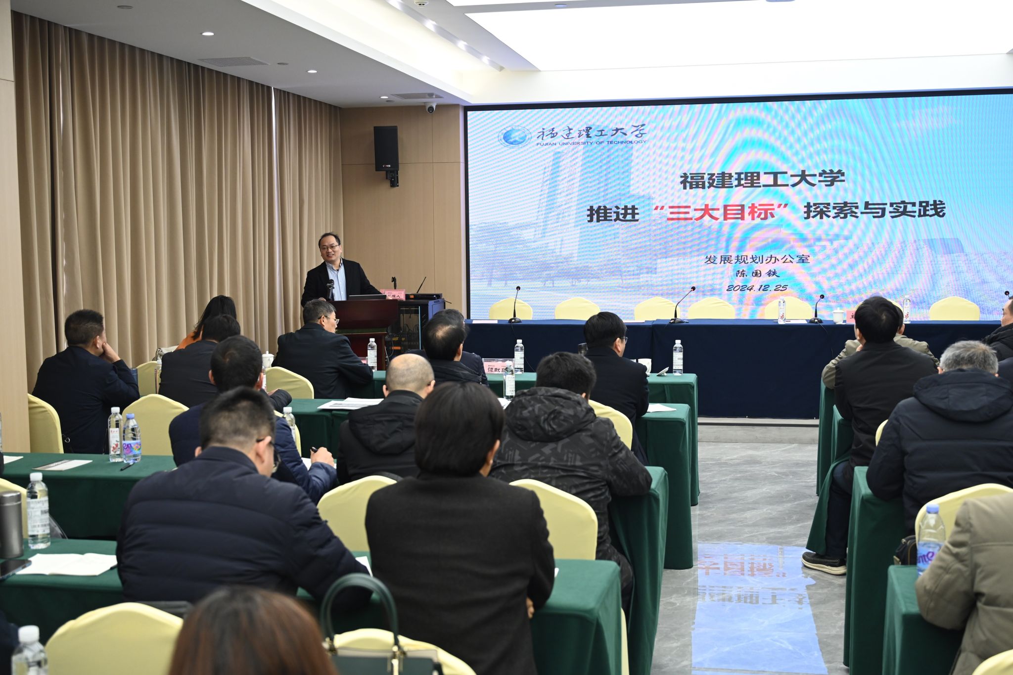 陈国铁以“福建理工大学推进“三大目标”探索与实践”为题作了专题报告,他围绕“规划先行”“统一思想”“落实实施”“探索实践”等方面,介绍了福建理工大学的先进经验和发展谋划。