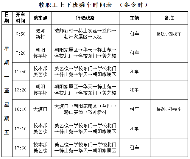 二、因工作需要,教职工10月1日至10月4日放假,10月5日至10月7日照常上班,两校区交通车正常运行。各学院着重进行预评后整改,按照学校预评估整改方案和“指挥部”相关指令,举一反三,落小落细,特别要强化教师教学能力。核心部门(按党政办通知)10月1日放假,2至7日照常上班,对标工作任务落实整改。