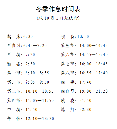 大一新生节假日进行军事训练,放假安排由学生工作部(处)和武装部通知。教职工和其余年级学生10月1日至3日放假,10月4日(补10月2日星期五的课)至8日上班、上课,9月27日(周日)和10月10日(周六)正常休息(安排有教学任务的按课表上课)。10月1日起,学校执行冬季作息时间。